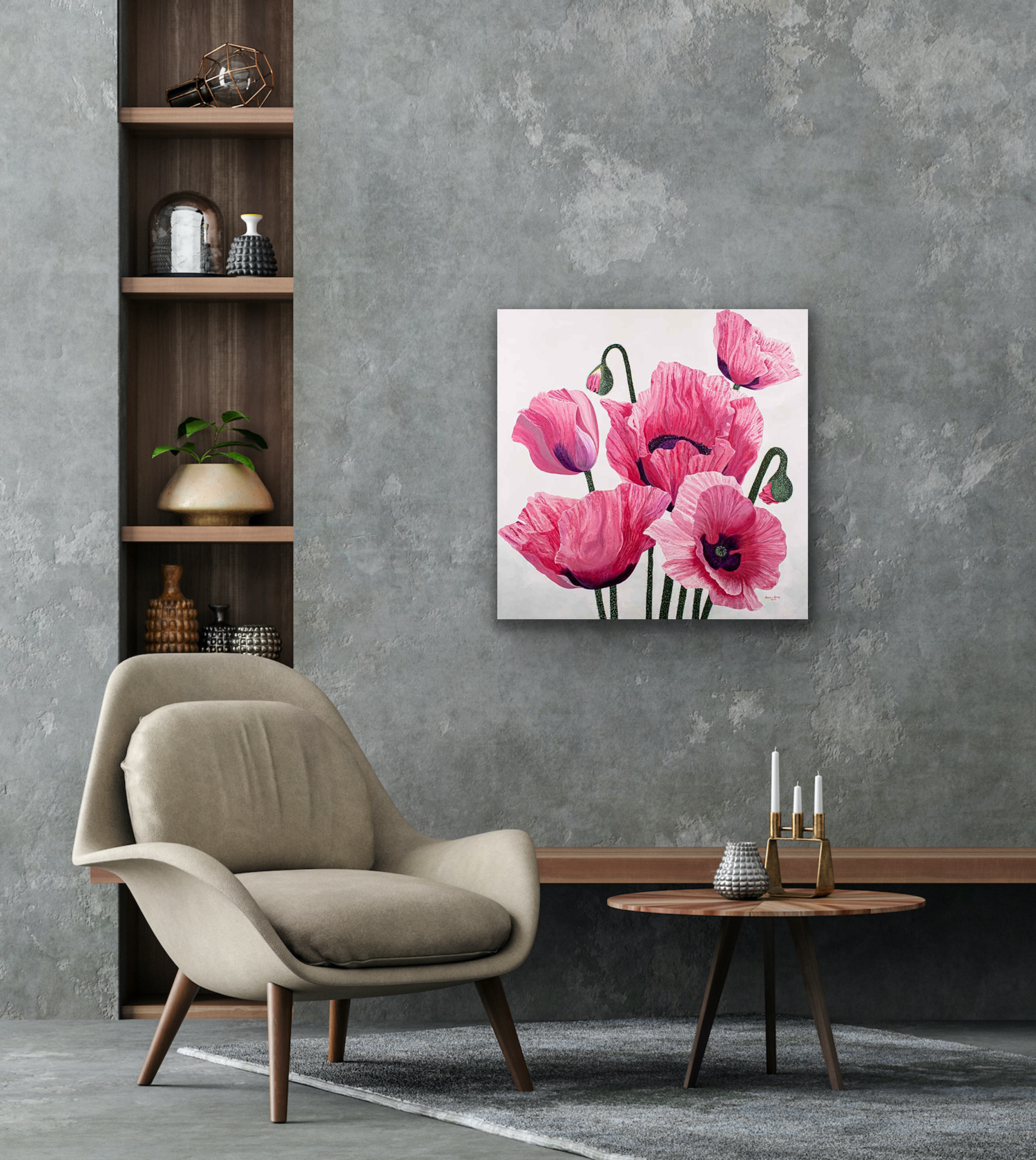 "Adoration" is a mesmerizing painting that will bring a touch of nature's beauty to your living space. This piece captures the essence of delicate wild poppies, their vibrant and soft pink petals portrayed with an astonishing level of detail. Each petal seems so fragile that it appears as if they are gently swaying in the breeze. The soft grey background enhances the poppies' elegance, making it an ideal choice for wall art that exudes a sense of grace and tranquility. Display "Adoration" in your home, and let the allure of nature's finest moments bloom in your space.