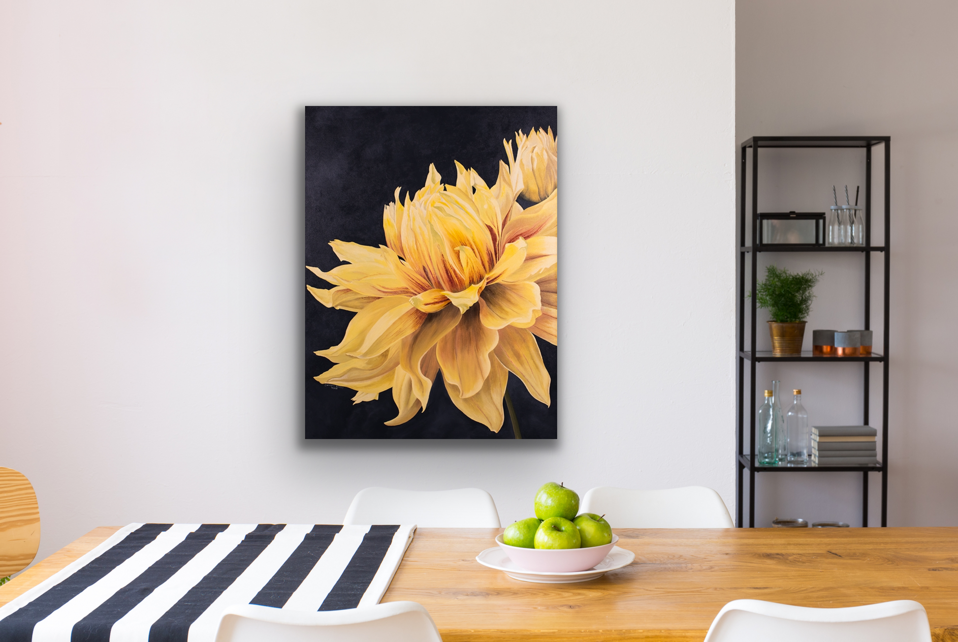A captivating painting that adds a touch of enchantment to your space. This diptych features vivid yellow poppies with an extraordinary level of detail on their petals. The petals are so delicately portrayed that you can almost see through them, creating the illusion that they are gently swaying in the breeze. In this stunning composition, a little dragonfly pays a visit to one of the petals, adding a touch of whimsy to the scene. Against a deep black background, the yellow poppies shine with brilliance. "Delightful Diptych" is the perfect choice for artwork that invites both beauty and wonder into your home.